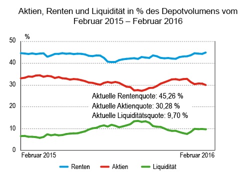 Wie schon erwähnt kauften die Verwalter Anleihen per Saldo hinzu. Dadurch (und durch die Wertveränderungen bei Anleihen und Aktien) stieg die Anleihenquote auf 45,26 Prozent. So hoch war sie zuletzt Mitte 2014 inmitten der akuten Griechenlandkrise. Dass die Verwalter verstärkt in Anleihen gehen, hat natürlich auch mit dem Momentum auf den Rentenmärkten zu tun. Die Zinsen sind seit Wochen im Sinkflug, entsprechend steigen die Kurse der Anleihen an. Kein Wunder, dass die Liquiditätsquote kaum ansteigt. Die Gelegenheit, ein paar Gewinne aus noch weiter sinkenden Anleihen mitzunehmen, ist wohl zu verlockend. Wir glauben auch, dass hinter dem Move strategische Motive stecken und auch deshalb das frei gewordene Vermögen nicht in Geld geparkt wird, um bei besserer Gelegenheit wieder in die Aktien zu fließen. Aber ob es wirklich so ist?