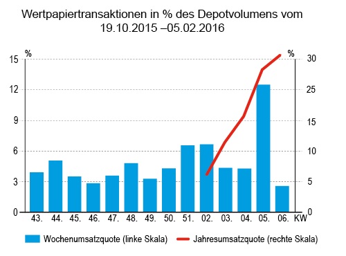 Nur 2,57 Prozent des Depotvolumens der uns gemeldeten Transaktionen wurden umgesetzt. Für das heftige Börsenumfeld ist das eine erstaunlich ruhige Hand, auch wenn man berücksichtigt, dass uns Meldungen „nur“ zu einem Depotvolumen von 750 Millionen Euro gemacht wurden. Die 19 Millionen Euro an Umsatz verteilten sich auf die verschiedenen Produktklassen Aktien, Anleihen und Fonds mit 4,5; acht und fünf Millionen Euro.
