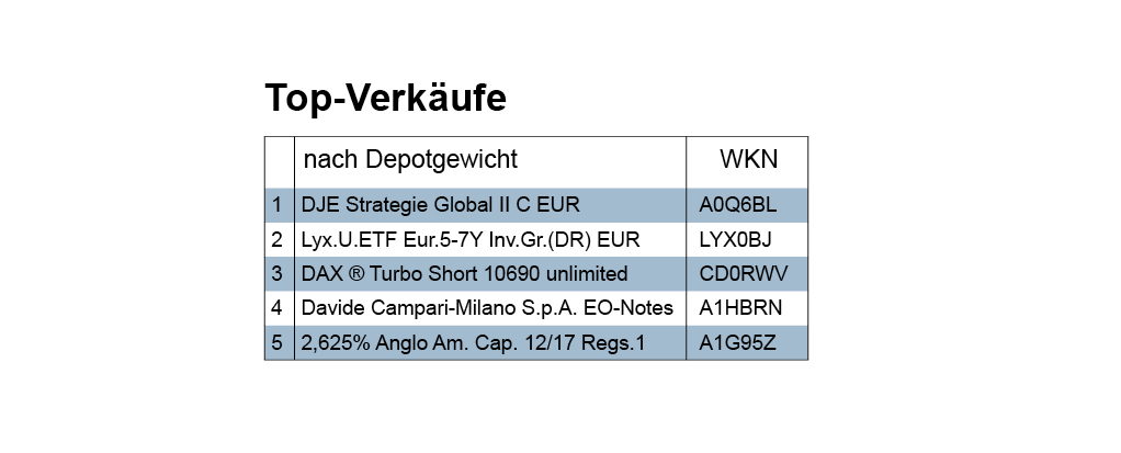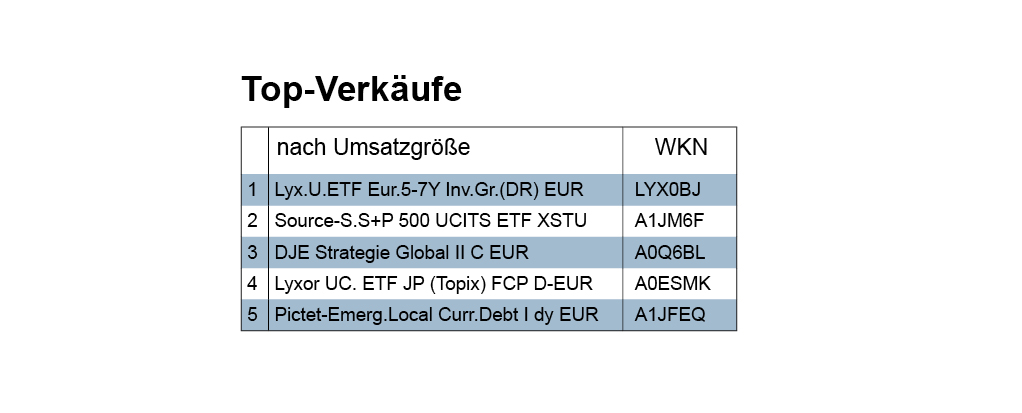 Die Verkäufe der Berichtswoche führten zu relativ hohen Gewinnen, auch nach Abzug der Verluste. Das war insbesondere Fondsverkäufen zu verdanken. Viele Verwaltungen wollen gerade bei ETFs Chancen der Gewinnrealisierung nicht verspielen. Einen erklecklichen Beitrag zu der positiven Bilanz steuerte die Veräußerung des bei den Topverkäufen gemäß Umsatzvolumen erstplatzierten Renten-ETFs (LYX0BJ) bei, der den „EuroMTS Investment Grade Eurozone Government Bond 5-7Y“ nachbildet. Die