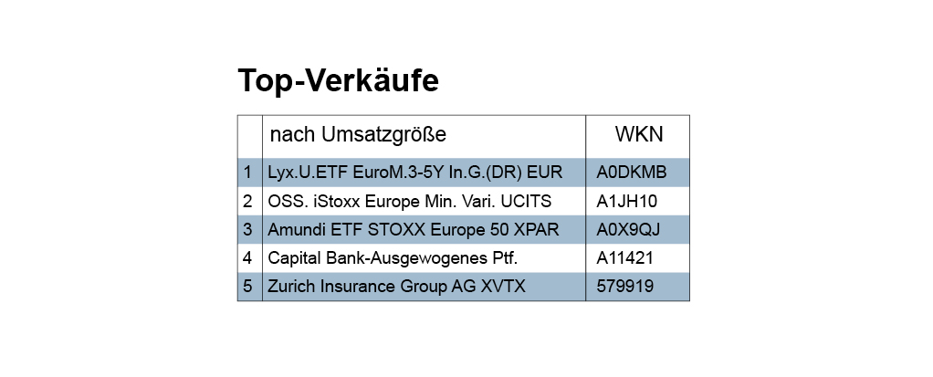 Ähnlich wie bei den Käufen ist auch bei den Verkäufen eine starke Konzentration des Umsatzvolumens auf wenige Transaktionen festzustellen. Die drei erstplatzierten ETFs im Verkaufsranking gemäß Umsatzvolumen trugen rund 83% des gesamten Verkaufsvolumens. Insbesondere die erst– und die zweitplatzierte Transaktion führten zu relativ hohen Gewinnen. Der erstplatzierte ETF (A0DKMB) bildet den Anleiheindex EuroMTS 3-5Y ab. Dieser setzt sich aus Bonds von Mitgliedstaaten der Eurozone mit einer Laufzeit zwischen drei und fünf Jahren zusammen.