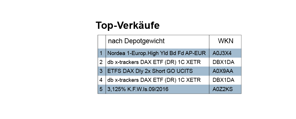 Die Verkäufe wurden bei einem Verkaufsumsatz von knapp 5 Mio. Euro wesentlich getragen von Aktien (3,18 Mio. Euro) und Fonds (2,41). Während die Verkäufe im Fondsbereich unter dem Strich ein Plus einfuhren, addierten sich Gewinne und Verluste bei Aktien zu einem Negativbetrag, was in diesen konkreten Fällen für ein schlechteres Timing bei Einzeltiteln als bei Indizes spricht. Denn bei Fonds wurden größtenteils ETF-Anteile veräußert. Die zugrundeliegenden Indizes waren unter anderem: Stoxx Europe 50;