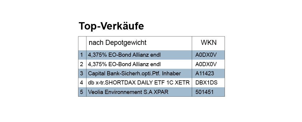 Der Verkaufsumsatz der Berichtswoche wurde angeführt von Festverzinslichen (6,87 Mio. Euro), gefolgt von Aktien (5,04), Derivaten (1,74) und Fonds (0,29). Bei Obligationen wurden fast nur Papiere europäischer Unternehmen abgegeben. Hier wurden vielfach Kursverluste hingenommen, weshalb die Gewinn-Verlust-Bilanz insgesamt negativ ausfiel. Das war aber auch bei Fonds und Zertifikaten nicht anders. Nur knapp positiv gestaltete sich die Bilanz im Aktiensektor. Dort beobachteten wir in der Berichtswoche