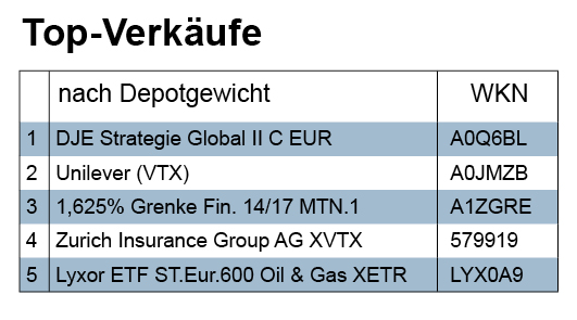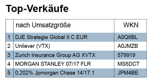 Bei den Verkäufen der Berichtswoche fiel der hohe Anteil von Bankanleihen auf, von denen sich hauptsächlich eine Vermögensverwaltung trennte. Insgesamt führten die meisten Verkaufstransaktionen der Woche zu geringeren Verlusten, manche zu größeren, und nur wenige zu Gewinnen. Von Kursgewinnen profitierte etwa die in beiden Top-Verkaufs-Rankings gelistete Abgabe von Aktien der Zurich Insurance Group.