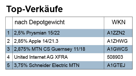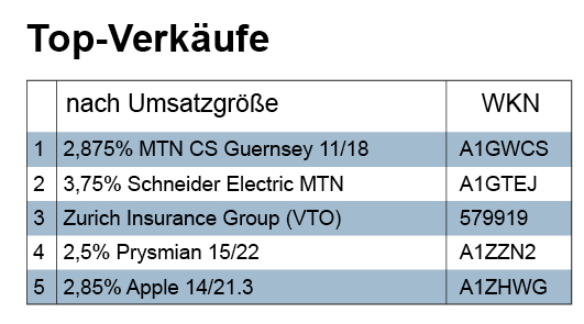 Beim Verkaufsvolumen lagen Anleihen vor Aktien und Fonds. Auch in den Top-Verkaufslisten bilden Anleihen aufgrund der relativ hohen Verkaufssummen pro Transaktion die klare Mehrheit im first-five-Bereich, während im second-five-Bereich der Top-Verkäufe Aktien dominieren.