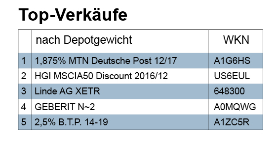 Bei den Verkäufen lagen in der hier zu besprechenden 34. Woche die Aktien mit einem Transaktionsvolumen von fast 2,9 Mio. Euro weit vor Anleihen (0,89) und Derivaten (0,15). Fondsanteile wurden nicht abgegeben.