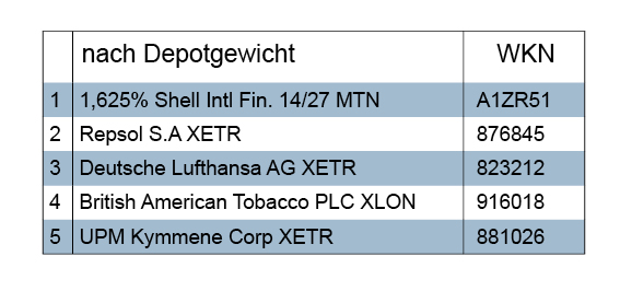 Die 12 Verkaufstransaktionen in der Berichtswoche verteilten sich auf 9 Wertpapiere: Auf vier Aktien (neben den beiden im Ranking geführten: Deutsche Lufthansa und Repsol), auf drei Bundesanleihen, auf eine Shell-Anleihe und auf ein Expresszertifikat. Interessant die beiden in unseren Rankings gelisteten Aktien: der Betrag beider Transkationen lag bei rund 472.000 Euro; und der Gewinnbetrag lag bei beiden gleichfalls im Bereich über 60.000 Euro.